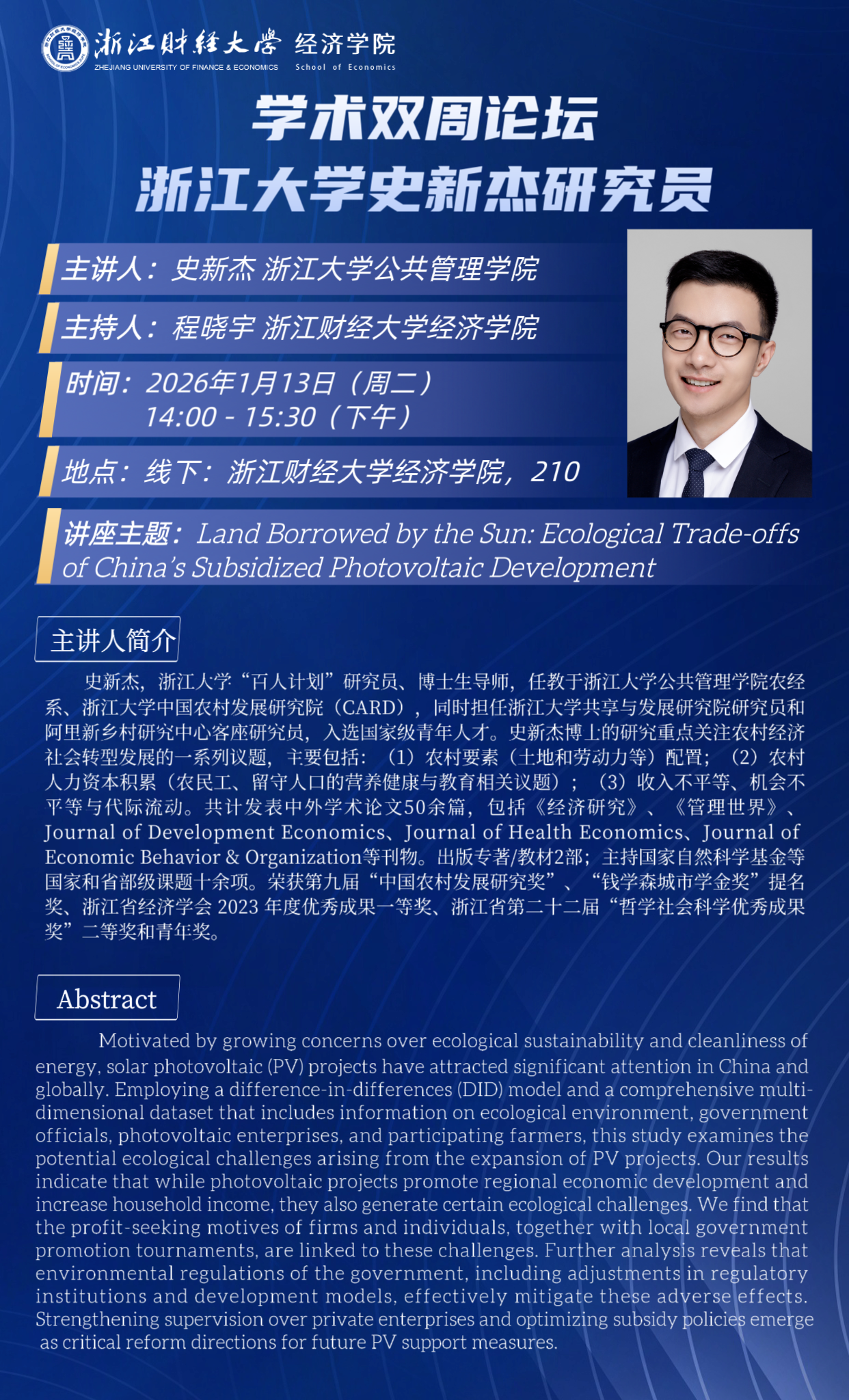 农经系、浙江大学中国农村发展研究院(CARD),同时担任浙江大学共享与发展研究院研究员和阿里新乡村研究中心客座研究员,入选国家级青年人才。史新杰博士的研究重点关注农村经济社会转型发展的一系列议题,主要包括:(1)农村要素(土地和劳动力等)配置;(2)农村人力资本积累(农民工、留守人口的营养健康与教育相关议题);(3)收入不平等、机会不平等与代际流动。共计发表中外学术论文50余篇,包括《经济研究》、《管理世界》、Journal of Development Economics、Journal of Health Economics、Journal of Economic Behavior & Organization等刊物。出版专著/教材2部;主持国家自然科学基金等国家和省部级课题十余项。荣获第九届“中国农村发展研究奖”、“钱学森城市学金奖”提名奖、浙江省经济学会 2023 年度优秀成果一等奖、浙江省第二十二届“哲学社会科学优秀成果奖”二等奖和青年奖。